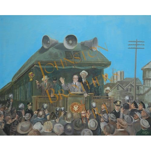 Print of Truman campaign train. Original was painted in oils on canvas and was commissioned as an illustration for a book of Presidential poems.