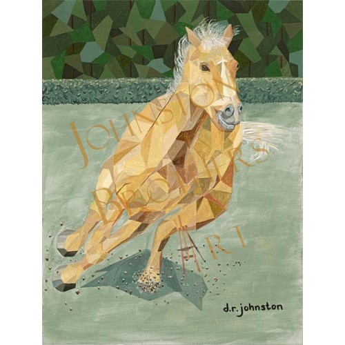 Print of "Run Like the Wind". The original was painted with acrylics on Canvates in an expressionist style depicting a Palomino running free in a pasture.