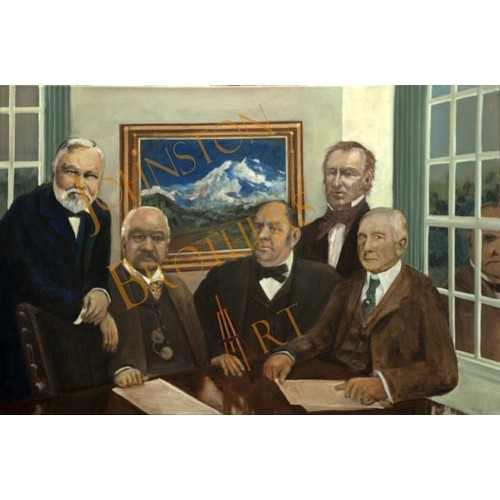 Print of McKinley Fundraiser. Depicts McKinley brain-trust meeting with McKinley himself looking in from the outside. A painting of Denali is hanging on the wall behind the fundraisers. Original was painted in oils on canvas and was commissioned as an illustration for a book of Presidential poems.